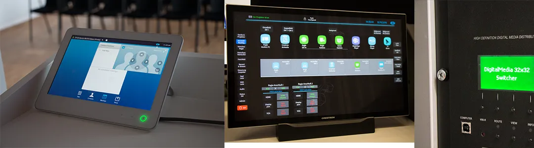 Eine intuitiver Benutzung mehrerer Geräte mit nur einem Touch sind Anforderungen die heute von einer modernen Mediensteuerung erwartet werden. Wir integrieren Displays, Projektoren, Audioanlagen, Videokonferenzen und vieles mehr mit Hilfe von innovativen Mediensteuerungssystemen in eine ganzheitliche Lösung. Facettenreiche Ausführungen können über individuell programmierbare Oberflächen realisiert werden. Unsere Programmierer haben das nötige Know-how und helfen Ihnen bei der Verwirklichung Ihrer personalisierten Anforderung.